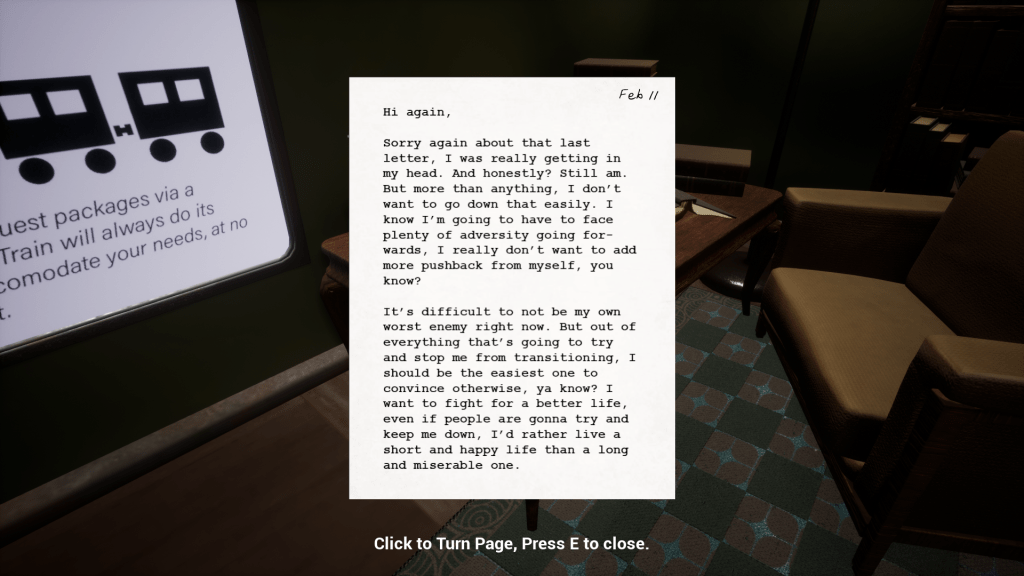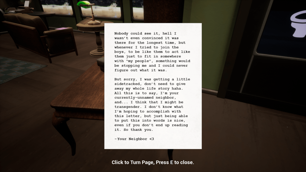 Finding Home is an original game that I created alongside Angelina Cook, which is currently in an alpha state. I was responsible for the narrative, game, and level design, and the majority of the programming. I implemented many elements of my own life into the narrative, in order to tell a bittersweet vertical slice of the transgender experience. I taught myself Unreal Engine 5 and its Blueprint system in order to make this game, and worked collaboratively with an artist in order to make both of our visions come forward in game.
